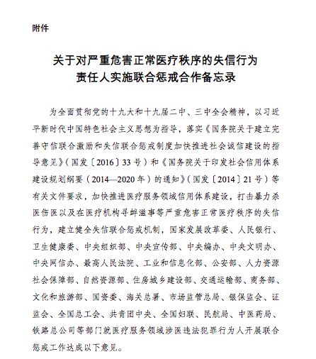 28部门联合惩戒,医闹、伤医等行为后果将空前严重,工作生活多方面受到实质性影响……10月16日,国家发改委官网印发《关于对严重危害正常医疗秩序的失信行为责任人实施联合惩戒合作备忘录》(以下简称备忘录)的通知,将对惩治涉医违法犯罪实施最严、最实“精准打击”。
